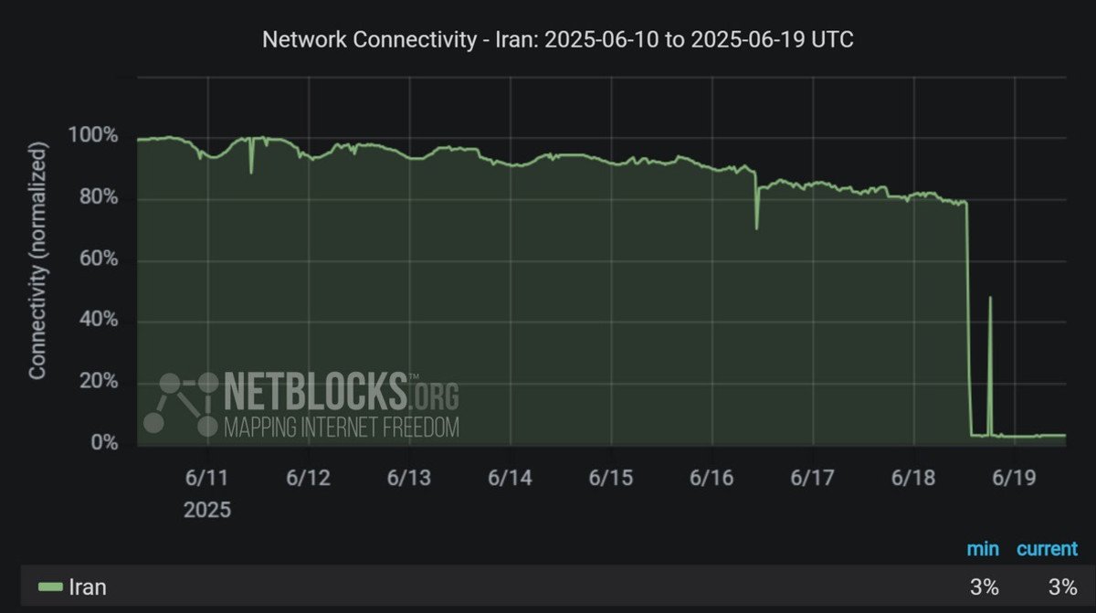 לפי נטבלוקס, הקריסה מגיעה לאחר שורה של שיבושים חלקיים שנמשכו בימים האחרונים, והם מיוחסים לכאורה לתקיפות צה"ל בעומק איראן ושימוש באמצעים אלקטרוניים לשיבוש התקשורת באיראן.