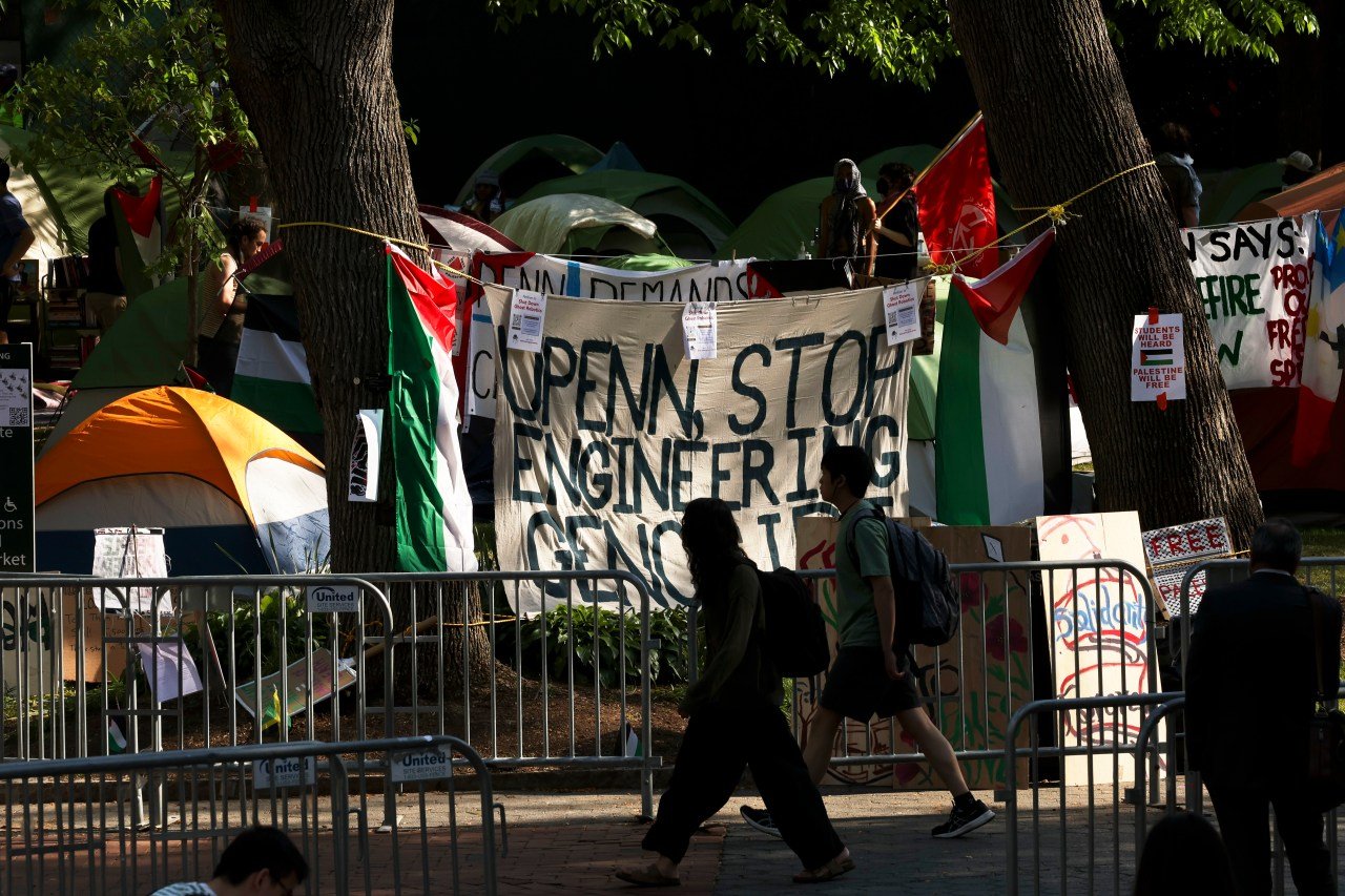 קובץ – אנשים חולפים על פני מאהל הסולידריות של עזה באוניברסיטת פנסילבניה בפילדלפיה, יום שלישי, 30 באפריל, 2024. בעקבות מפגינים פרו-פלסטינים בקמפוסים של מכללות שקראו לאוניברסיטאות להתנתק מישראל, הסנאט של מדינת פנסילבניה ביום חמישי, יוני 27, 2024, אישרה חקיקה שתחסום סיוע ממלכתי מללכת לכל אוניברסיטה שמחרים או מתנערת מישראל. (מוניקה הרנדון/The Philadelphia Inquirer דרך AP, File)