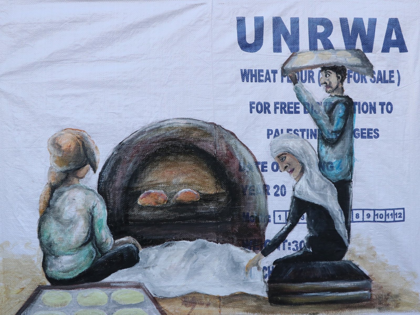 "כשאני מצייר על תיק קמח, זה מרגיש כאילו אני כותב את ההיסטוריה שלנו עם מברשת טבילה בסבל וחוסן," אמר אל-ג'רג'אווי.