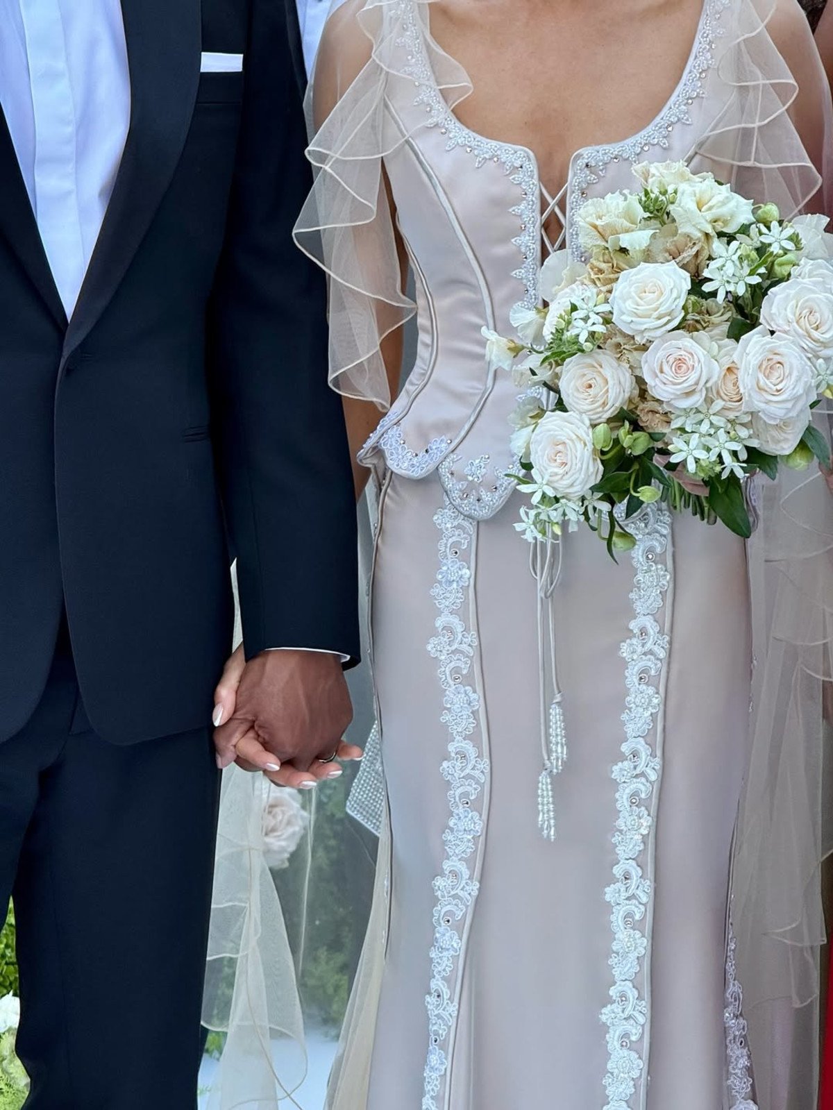 "הוא הצליח לתפוס את האישיות שלי כי השרטוטים שלו הם מאוד אישיים," ג'נל ממשיכה. "הוא קיבל השראה מהעיצוב המקורי, אבל זה באמת היה בשבילי. הוא אוהב את הרגליים שלי, אז הוא אמר: 'אני חייב לשים שמה שסע'." המעצב גם חשב שהאנסמבל צריך להיות בשילוב עם רעלה, אז הוא הוסיף עיצוב רומנטי מסולסל באורך קתדרלה עם פרחים שמסגרים את הפנים ללוק המקורי.
