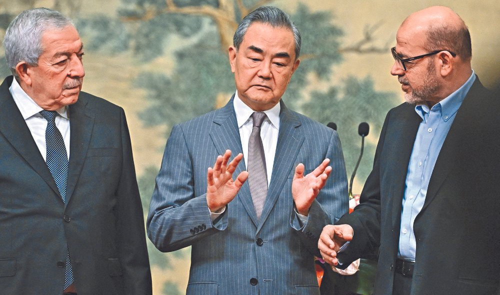 שר החוץ הסיני וואנג יי ריכז 14 קבוצות פלסטיניות בבייג'ינג, מ חמאס לפתח, הג'יהאד האסלאמי לחזית העממית לשחרור פלסטין (PFLP), תוך התעלמות מתווית הטרור שלהם על ידי ארה"ב וישראל, ואף לגרום להם לחתום על פרוטוקול ל"פיוס לאומי" פלסטיני נגד "תוקפנות ציונית".
