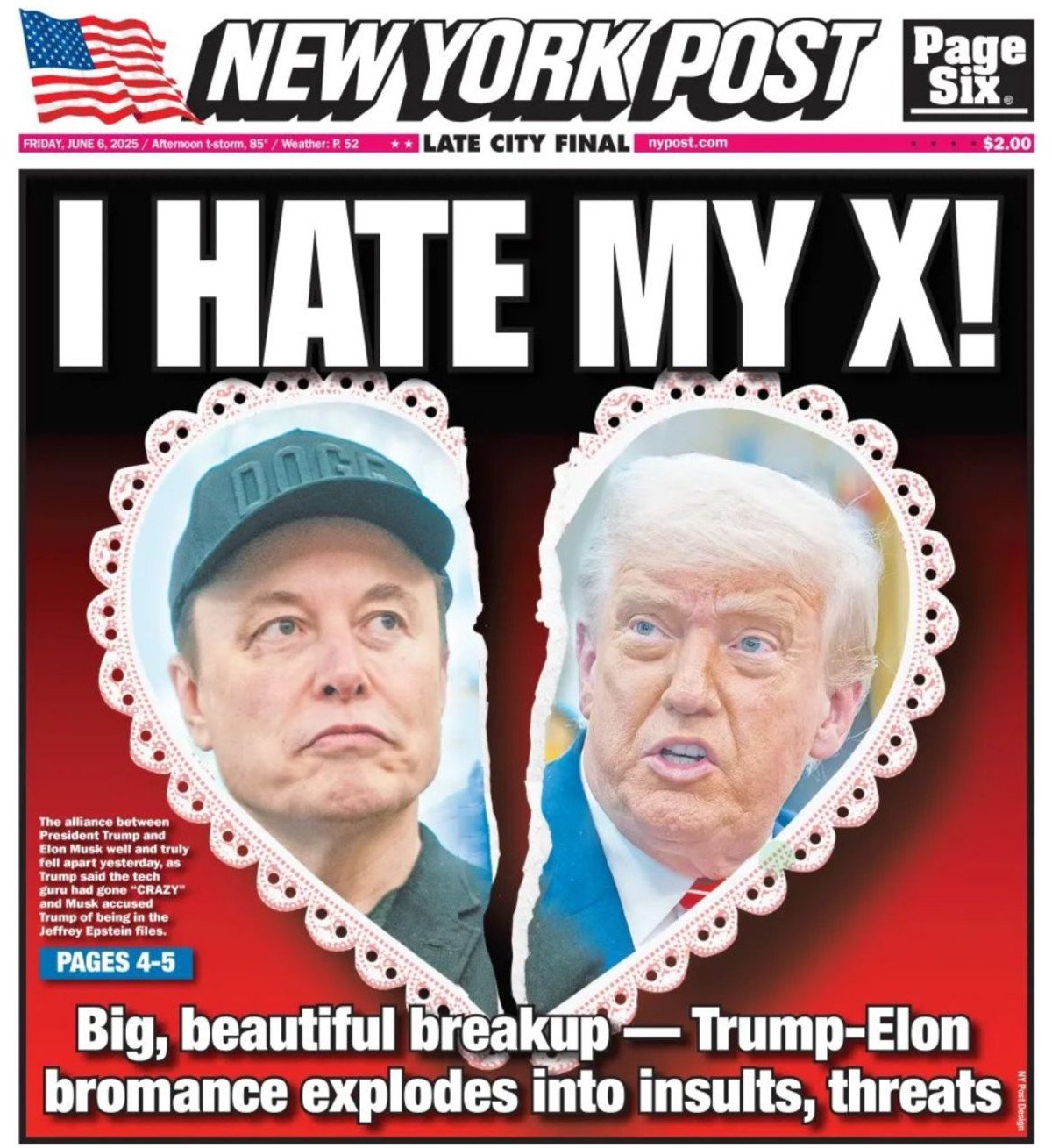 מלחמת הציוצים שנערכה אתמול בין השניים, שנבעה מביקורתו של מאסק על הצעת חוק המס וההגירה של טראמפ, גרמה לכך שמאסק רמז שטראמפ היה מפסיד בבחירות 2024 בלעדיו. הוא תמך בקריאות להדחתו של טראמפ ואף טען שטראמפ מעורב בתיקים של ג'פרי אפשטיין. "זו הסיבה האמיתית שהם לא פורסמו. שיהיה לך יום נעים, דונלד טראמפ!" פרסם מאסק. בתגובה לכך, טראמפ אמר שמאסק "השתגע", ושקל לבטל את החוזים והסובסידיות הממשלתיים של מאסק.