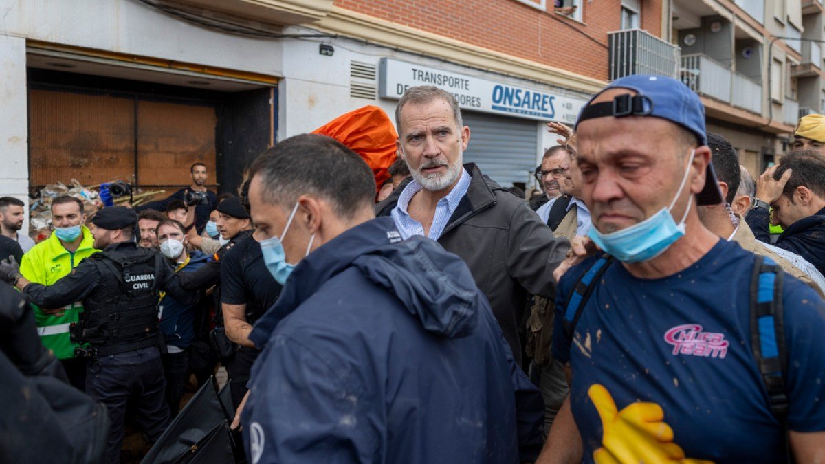 מאות תושבי פרבר ולנסיה שנפגעו קשות מהשבוע שעבר שיטפונות קטלניים הפגינו במהלך ביקור של המלך הספרדי פליפה, המלכה לטיזיה וראש הממשלה פדרו סאנצ'ס, כשכמה מפגינים זרקו עליהם בוץ.