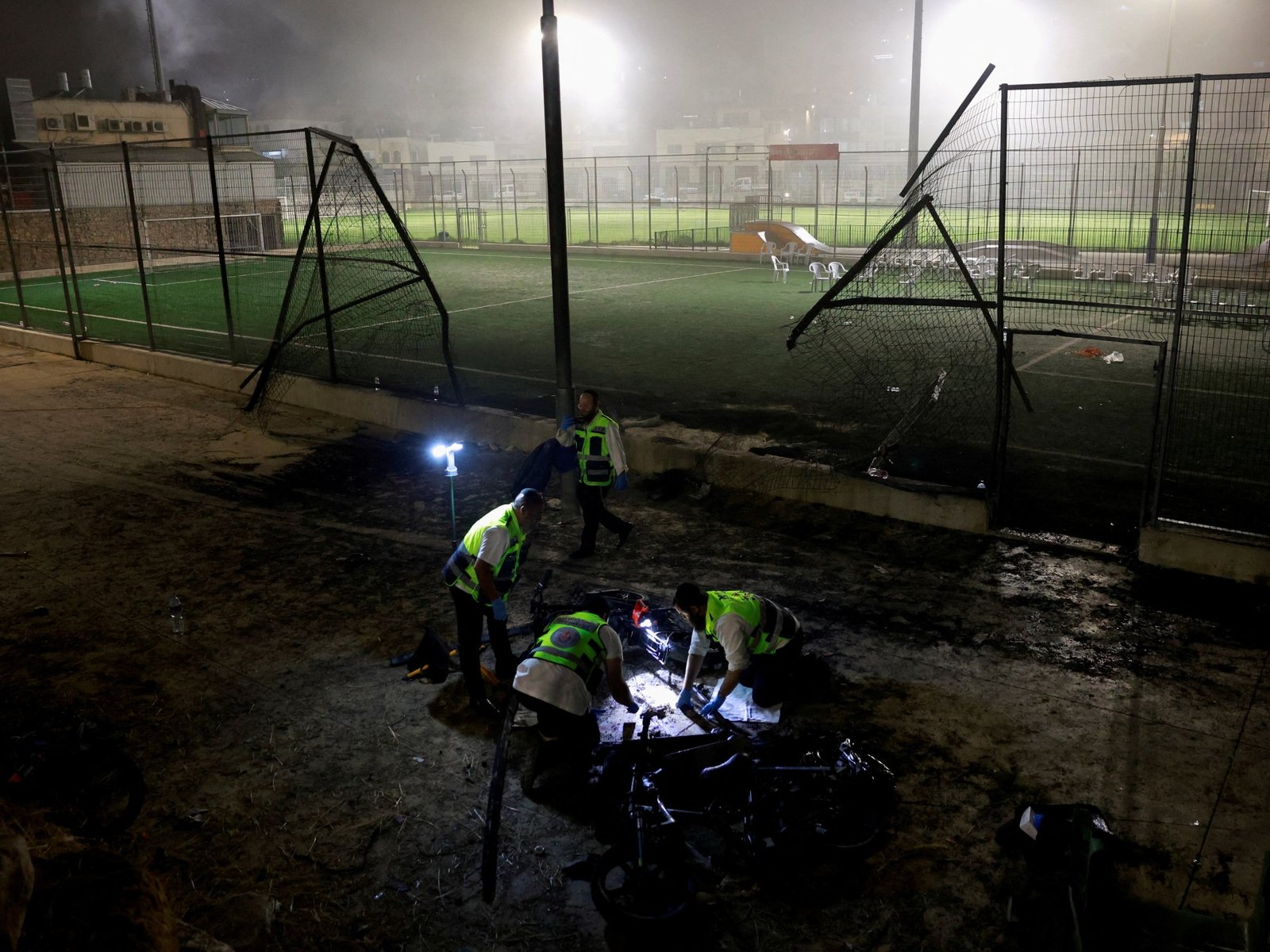בהודעת וידאו מאתר הפיגוע ביום ראשון בבוקר, חזר ראש הצבא הישראלי הרצי הלוי על הטענה כי רקטת פלאק מתוצרת איראן – שהופעלה על ידי חיזבאללה מאז תחילת קרבות הגבול באוקטובר האחרון – נושאת 53 ק"ג (116 פאונד). ) ראש נפץ פגע במגרש הכדורגל.