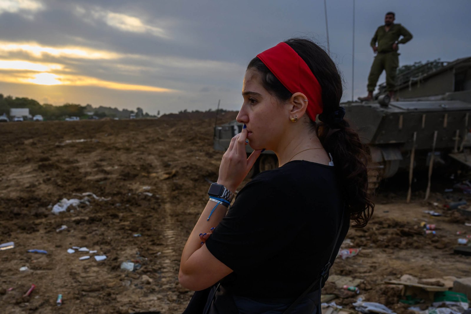 אישה צופה איך כוחות צה"ל מגיעים לאזור היערכות בעוטף עזה לראשונה מאז התקיפה של חמאס ב-17 בדצמבר בדרום ישראל. צילום: אלקסי ג'יי רוזנפלד