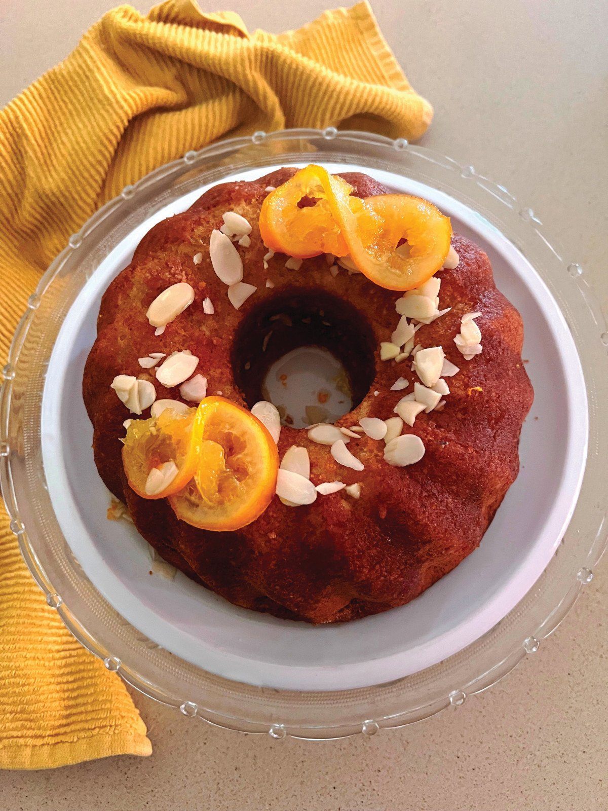 לכבוד החג בחרתי לעטר את העוגה בפרוסות תפוזים מרוככות בסירופ סוכר שאותו מזגתי על פני העוגה, ובשקדים מולבנים. אומנם העוגה עשויה מחומרים מעטים מאוד, אבל יש לה טעם נפלא. זו עוגה שמתכתבת בצורה מושלמת עם ימי החורף הסגריריים הגשומים. העוגה הנאפית בתנור מפיצה ניחוח משכר בבית במהלך האפייה. עכשיו נותר להכין כוס תה מהביל ולהגישו בצד פרוסת עוגה רכה וטעימה.