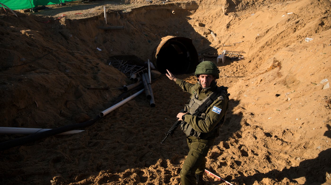 דובר הצבא הישראלי, ניצב דניאל הגרי, עומד בפתח המנהרה ליד הגבול עם ישראל ב-15 בדצמבר 2023, צפון רצועת עזה. הצבא הישראלי אמר שזו המנהרה הגדולה ביותר שמצאו עד כה בעזה.