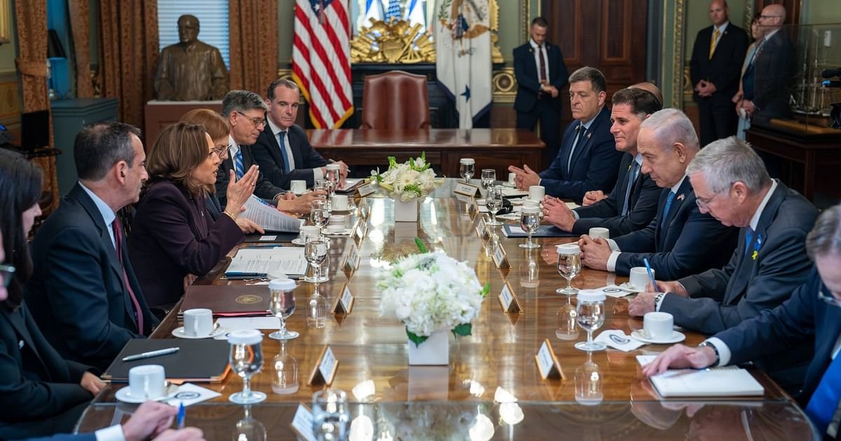 "אמרתי את זה הרבה פעמים, אבל כדאי לחזור על זה. לישראל יש זכות להגן על עצמה, והאופן שבו היא עושה זאת חשובה. חמאס הוא ארגון טרור אכזרי. ב-7 באוקטובר, חמאס הפעיל את המלחמה הזו כאשר טבח ב-1,200 חפים מפשע, כולל 44 אמריקאים. חמאס ביצע מעשי אלימות מינית מחרידים ולקח 250 בני ערובה. יש אזרחים אמריקאים שנשארים בשבי בעזה", אמר האריס לכתבים מיד לאחר שפגש את נתניהו בבניין משרד ההנהלה של אייזנהאואר במתחם הבית הלבן.