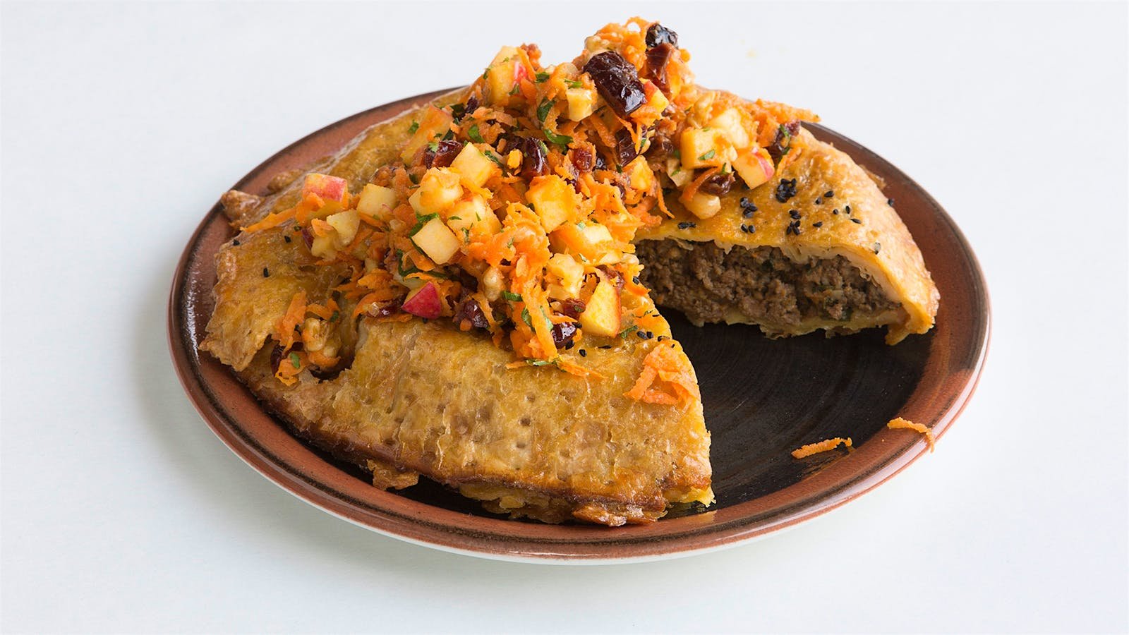 4. משרים את המצות במים חמימים עד לגמישות, כדקה. מרפדים את תחתית המחבת המשומנת מברזל יצוק במצה, מפרקים את החתיכות לפי הצורך כדי לכסות לחלוטין את תחתית המחבת ודפנותיה. מורחים את תערובת הבקר על התחתית ומכסים את החלק העליון במצה נוספת, לוחצים בקצוות לאטימה. מברישים בביצה הטרופה ואופים עד שהמינה זהוב-שחום ופריך, כ-30 דקות. מניחים לעמוד במשך 5 דקות.