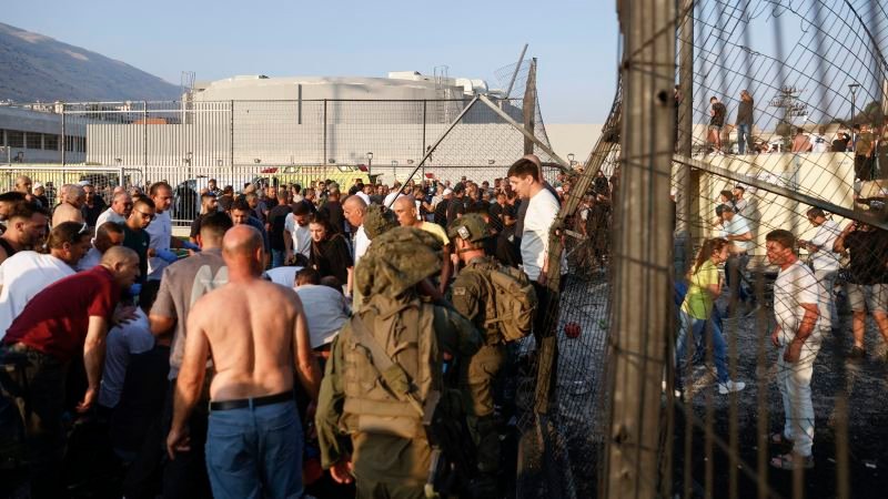 כוחות הביטחון הישראליים ותושבים מקומיים מתאספים בשבת באתר שבו דווח על תקיפה מלבנון בכפר מג'דל שמס באזור הגולן המסופח לישראל.