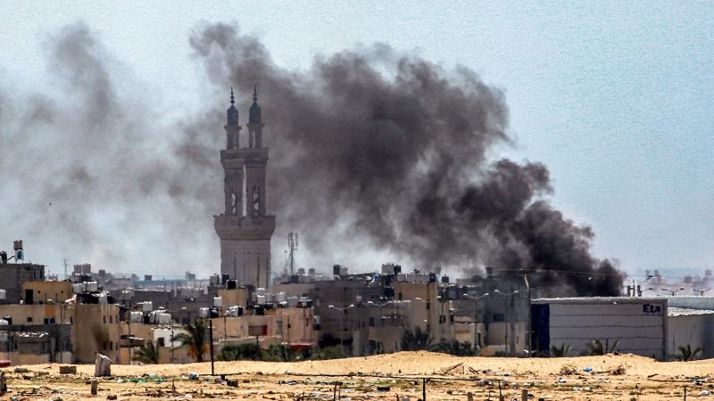 תמונה זו שצולמה מח'אן יונס בדרום רצועת עזה מציגה ערמות עשן המיתמרות במהלך קרבות מתמשכים בשכונת סולטן בצפון מערב רפיח ב-18 ביוני 2024, על רקע הסכסוך המתמשך בשטח הפלסטיני בין ישראל לחמאס.