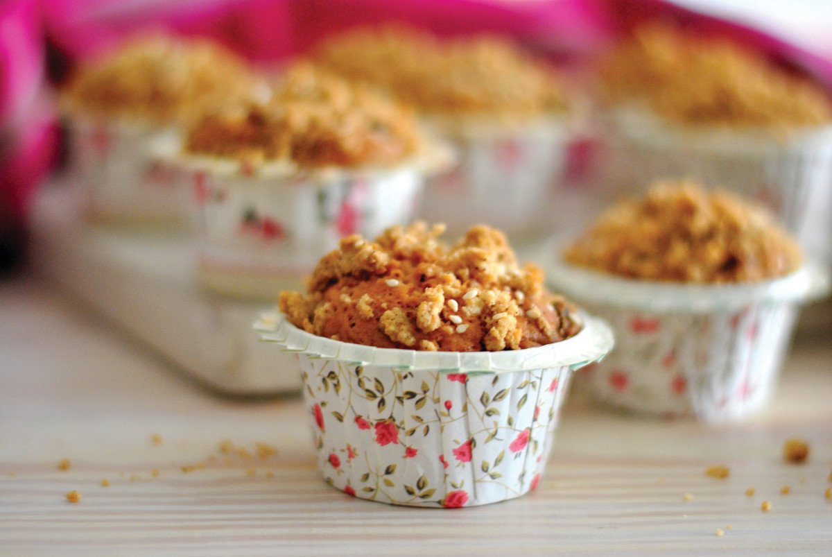 אפשר לשלב בבצק אגוזים ופירות מיובשים שאהובים עליכם. אם רוצים, אפשר לצפות בקרמים ובציפויים שונים, אבל אני מעדיפה את המאפינס ללא ציפוי או קרם. לכן בחרתי לשמור מעט מבצק המאפינס, הוספתי לו קמח וגרגירי שומשום וערבבתי הכל בקערית ליצירת פירורים. בעצם, זה סוג של שטרויזל שאותו פיזרתי על פני המאפינס. אפיתי עד לקבלת גוון חום־זהוב. כך לא צריך לצפות בקרם. החן והיופי מתקבלים מהשטרויזל.