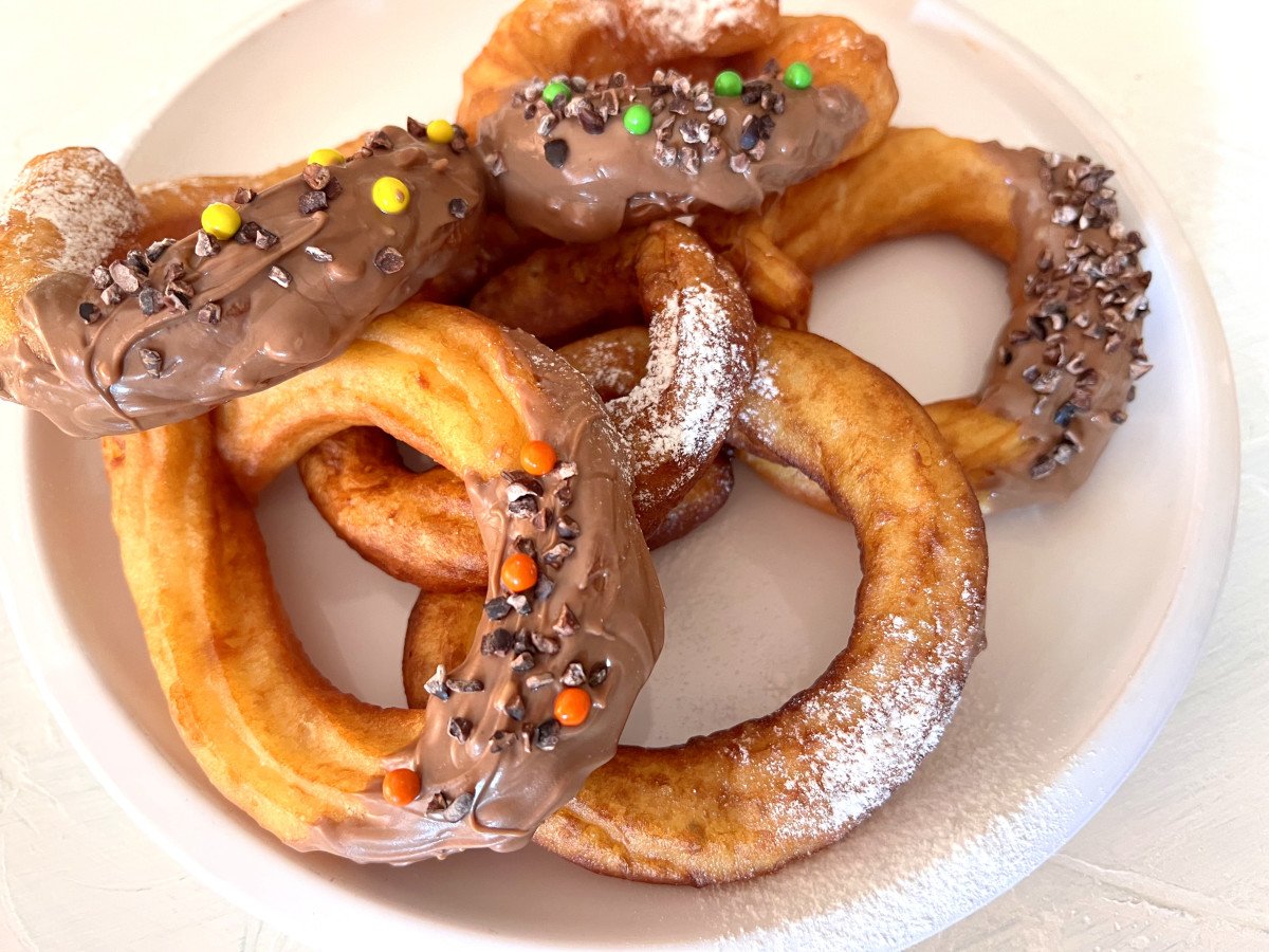 המתכון השלישי הוא להכנת צ'ורוס בצורת כעך. הצ'ורוס אופייניים למטבח הארגנטינאי, הספרדי והברזילאי. הם עשויים מבצק רבוך העובר טיגון עמוק. יש להם גרסאות הכנה שונות וגם צורות הגשה שונות עם מטבלים, ציפויים ועוד פינוקים. בחרתי לעצב אותם הפעם בצורת כעך ולהגישם כשהם טבולים בציפוי גנאש שוקולד ובעיטור סוכריות.