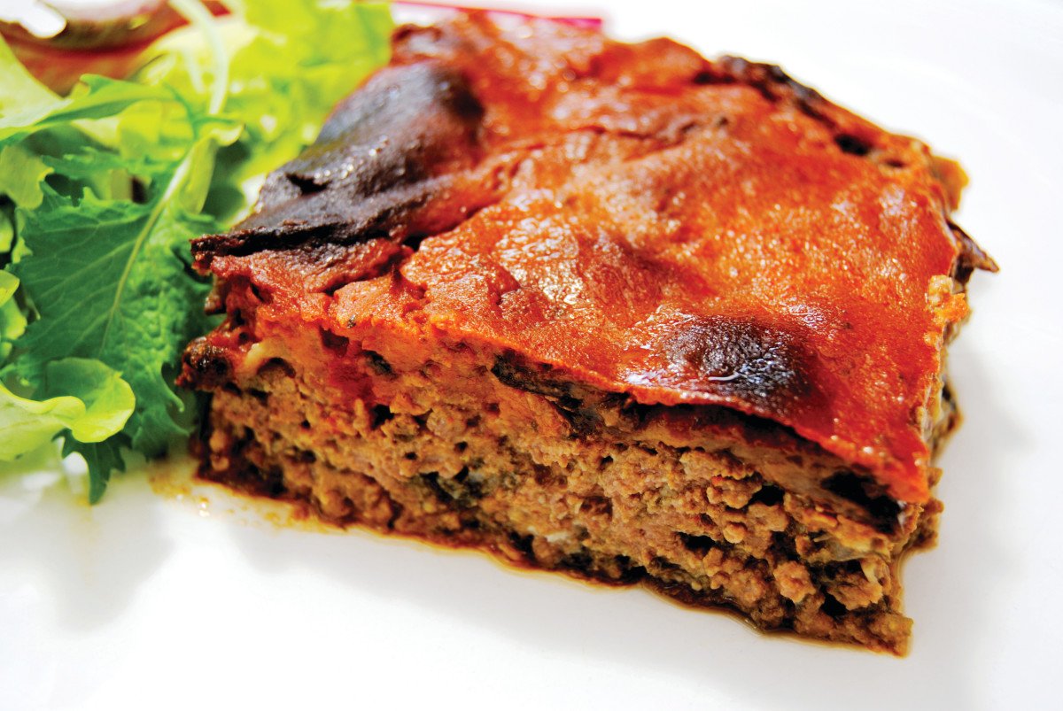 5. משמנים היטב את התבנית ומרפדים את תחתית התבנית בפרוסות החצילים. מעל מניחים את כל הבשר ומהדקים לשכבה אחידה. מסדרים על מלית הבשר פרוסות עגבנייה ומעל את יתר פרוסות החצילים.