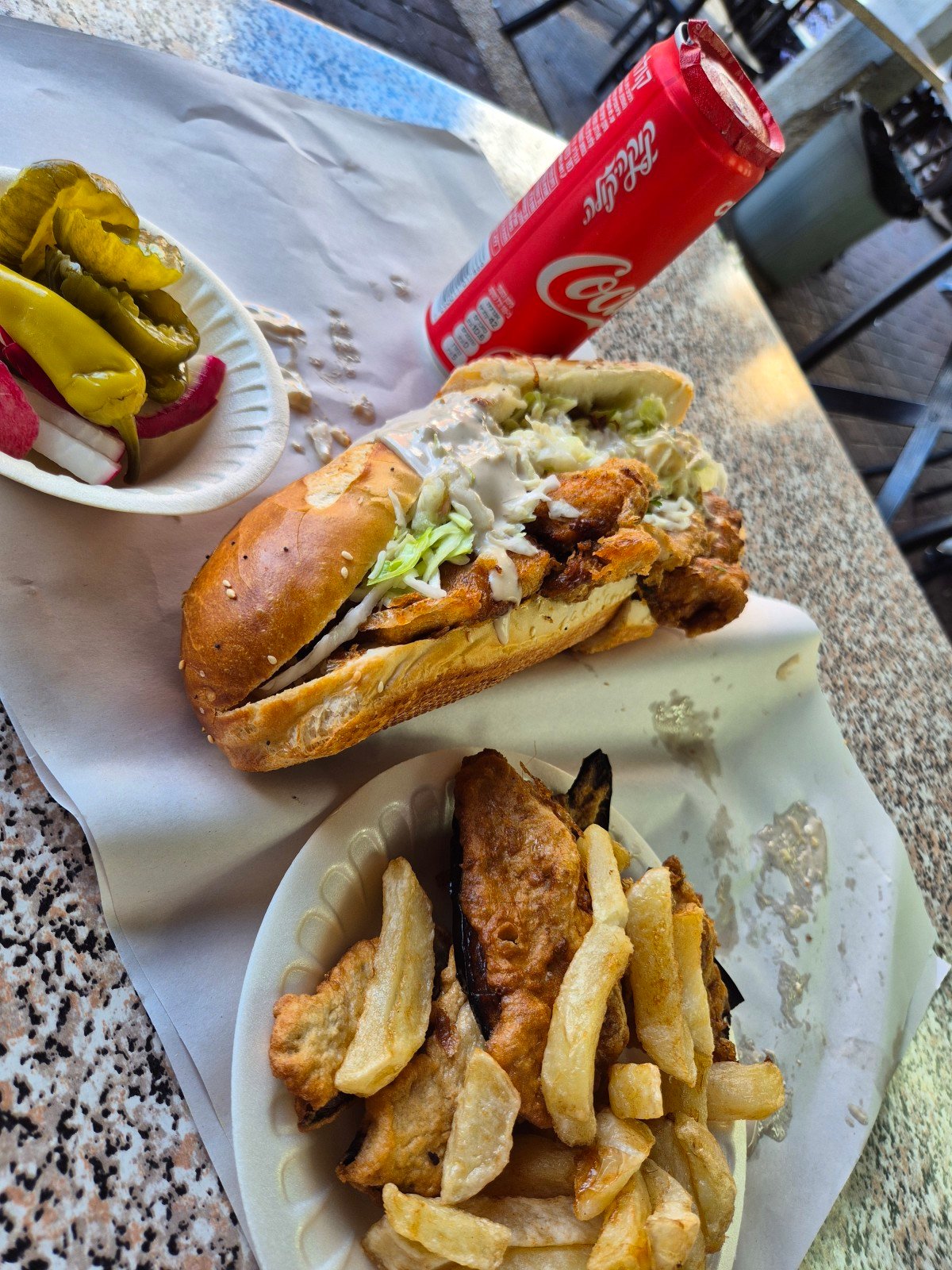 ובכן: פחית קולה "אדומה", באגט עמוס בערמה של שניצלים ומרוח בכל מני סלטים ומתבלים, כולל ירקות וכרוב, צ'יפס, חצילים ובר חמוצים קטן למילוי עצמי (סטנדרטי: זיתים סוריים, מלפפונים חמוצים ופלפלים חריפים), הסתכמו לחשבון של 60 שקלים בלבד.