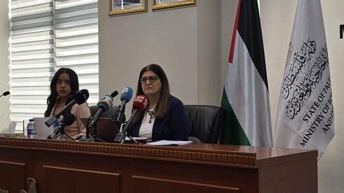 Palestinian Authority Minister of State for Foreign Affairs Dr. Varsen Aghabekian (R) and translator Israa Da’as (L) speak to the press at the Foreign Ministry in Ramallah, on the West Bank, Aug. 13, 2025