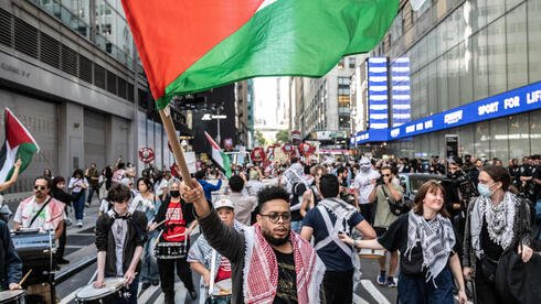 A Palestinian flag flies over and anti-Israel encampment at Columbia University in New York