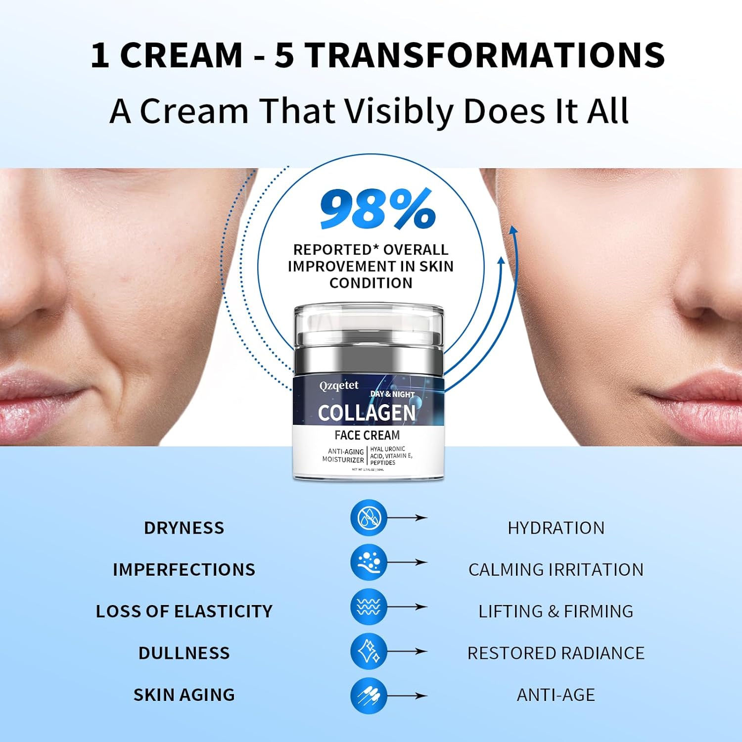【Ultimate Anti-Aging Cream】Our powerful skincare formula with collagen, hyaluronic acid and retinol works to diminish the signs of aging and keep your skin moisturized and filled with a youthful glow. Our facial moisturizer helps boost skin elasticity and renewal, restoring texture and smoothing out wrinkles and fine lines