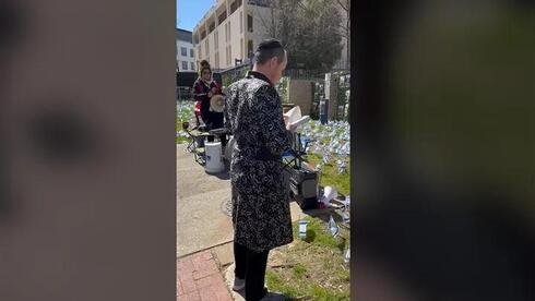 Rabbi Shmuel Herzfeld praying for the release of the hostages outside the Israeli Embassy in Washington has he is being harassed by pro-Palestinian protesters