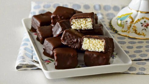 4. Remove the coconut mixture from the fridge, cut into cubes or bars, and dip each piece in the melted chocolate.