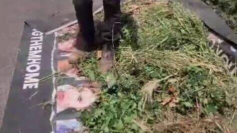 Municipal workers step on signs calling for the hostages to be released