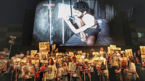 Protesters in Tel Aviv under the video of Evyatar David released by Hamas
