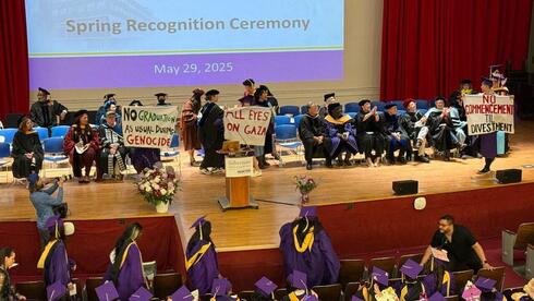 The event, held in Manhattan and part of the City University of New York (CUNY) system, turned into a demonstration as students displayed Palestinian flags, chanted slogans and held signs calling for the school to divest from Israel. The protest erupted as the dean began her speech, with demonstrators shouting and some ascending the stage wearing keffiyehs.