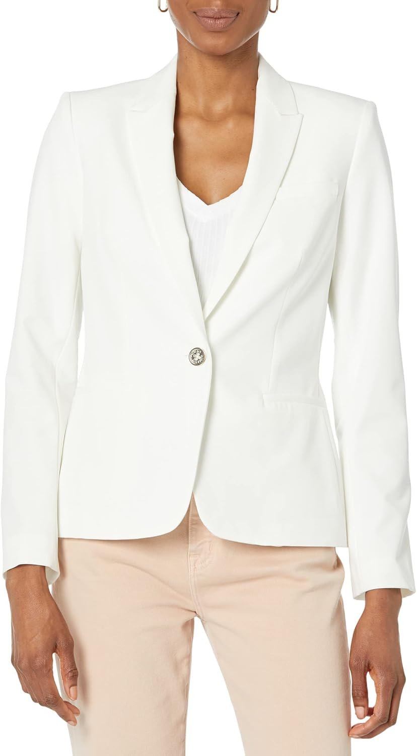 This Tommy Hilfiger Women's Blazer is a business jacket with a single button closure, a TH logo at the left lapel, shoulder pads, welt pockets, elbow patches, and buttons at the sleeves.